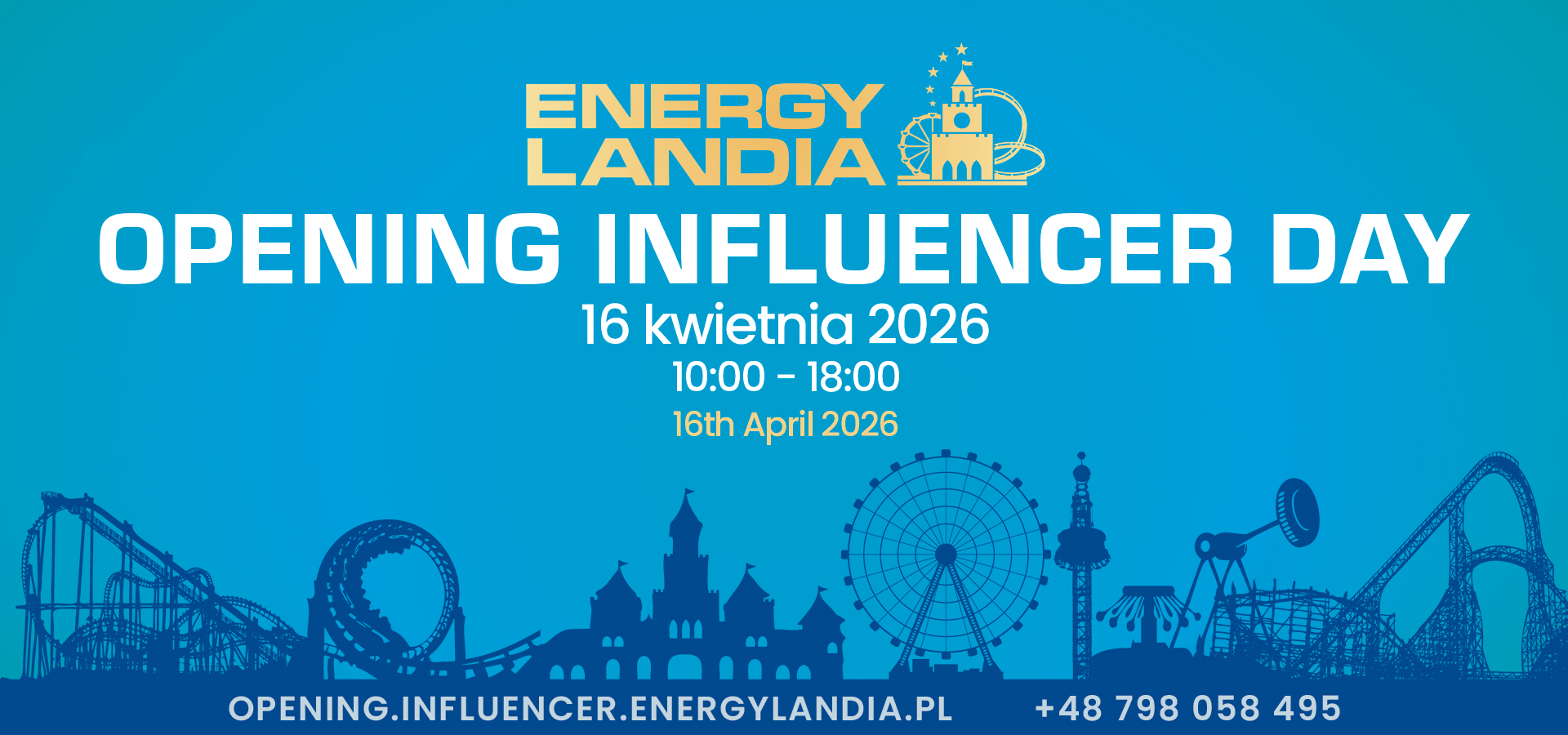 Zanurz się w świecie adrenaliny oraz niezapomnianej zabawy i rozpocznij z nami sezon 2026 w Energylandii! 🎢 🎉Opening Influencer Day to wyjątkowe wydarzenie, które oficjalnie otworzy nowy sezon pełen energii, atrakcji i niezapomnianych wrażeń. Od pierwszych chwil po przekroczeniu bram Parku poczujesz, że to początek czegoś wyjątkowego – muzyka, pozytywna atmosfera i klimat rollercoasterów wprowadzą Cię w wiosenny mood 🌸🎡 Jednym z kluczowych momentów dnia będzie uroczyste otwarcie sezonu 2026, które symbolicznie rozpocznie kolejne miesiące pełne emocji, eventów i spektakularnej zabawy w Energylandii – Parku Rollercoasterów nr 1 w Europie🥇 A to dopiero początek atrakcji! Na uczestników Opening Influencer Day czeka między innymi: 🎀Uroczysty Opening z udziałem artystów i Maskotek 🎢 20 zakręconych rollercoasterów 🎠 Ponad 100 atrakcji 🎡 7 wyjątkowych stref tematycznych 🍬 🎁 Koło fortuny z nagrodami 🍔 Wiosenna oferta gastronomiczna 📸 Eventowy klimat idealny pod tworzenie contentu Opening Influencer Day 🤳🏼 to nie tylko inauguracja nowego sezonu, ale też przestrzeń do spotkań i wspólnego celebrowania wiosny w Energylandii. Bądź częścią otwarcia i pokaż swoim obserwatorom, jak zaczyna się sezon pełen emocji 🌞⚡ 📍 Wypełnij formularz, odbierz akredytację i rozpocznij sezon letni 2026 razem z nami!